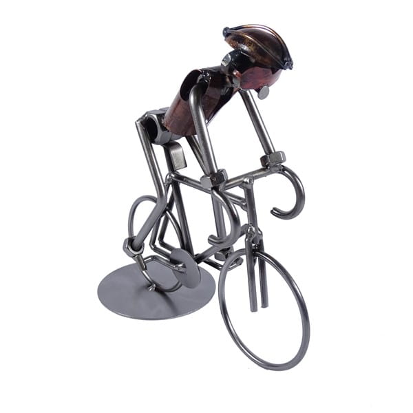 Metalowa figurka przedstawiająca kolarza podczas jazdy.