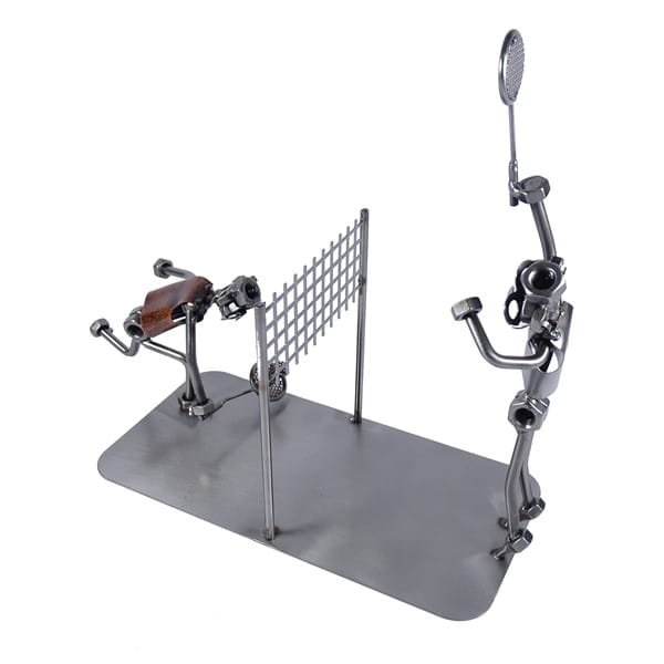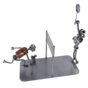Oto metalowa figurka przedstawiająca mecz w Badmintona, oddająca zaciętość pojedynku tej dynamicznej gry.