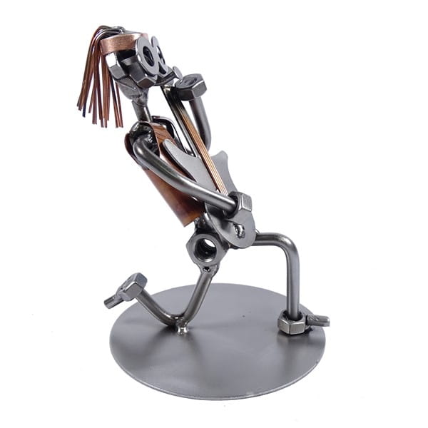 Metalowa figurka przedstawiająca gitarzystę rockowego.
