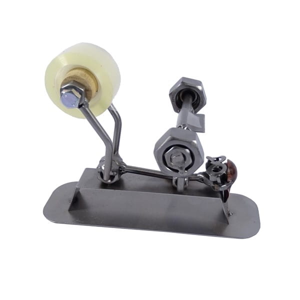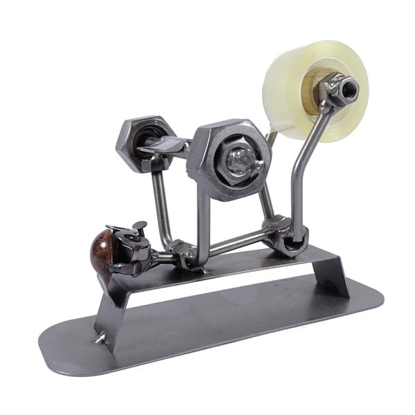 Oto metalowa figurka przedstawiająca kulturystę wyciskającego sztangę jako praktyczny uchwyt na taśmę klejącą.