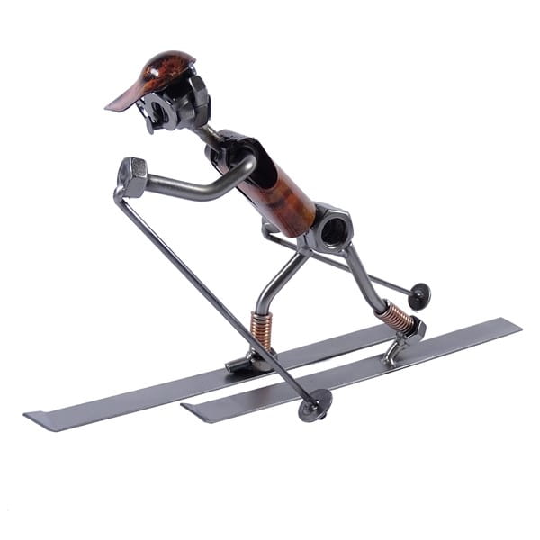 Metalowa figurka przedstawiająca narciarza biegowego.
