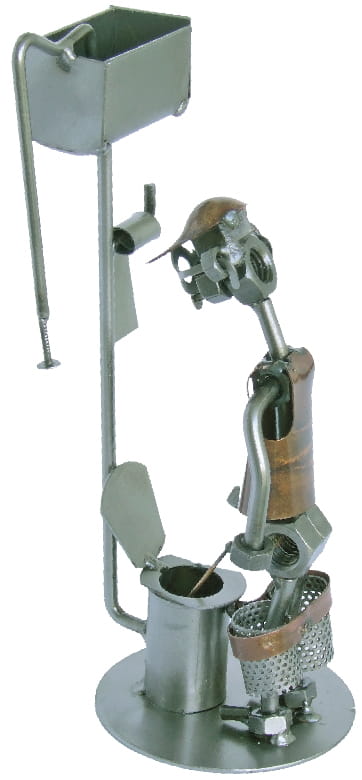 Metalowa figurka przedstawiająca wizytę w męskiej toalecie.