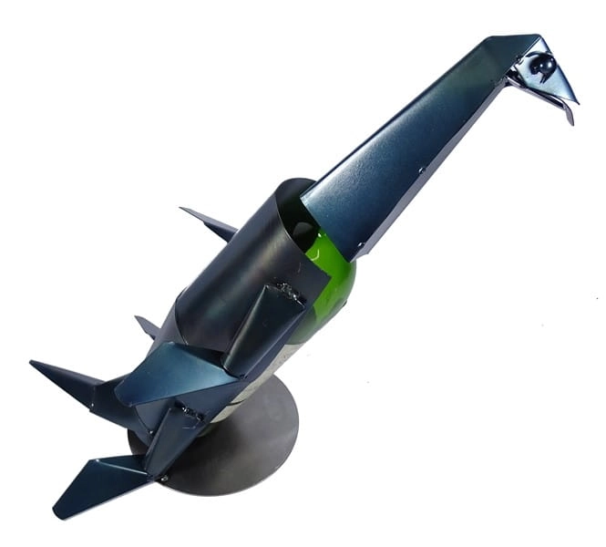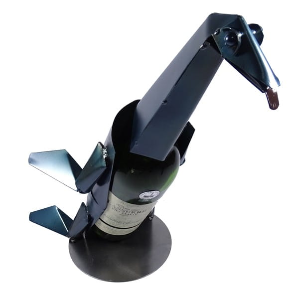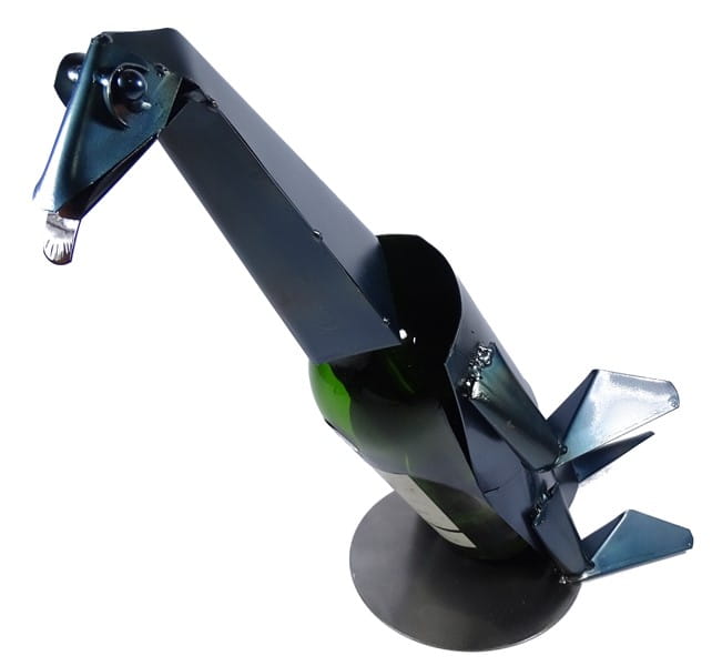 Metalowa figurka przypominająca potwora z lochnees jako stojak na wino.