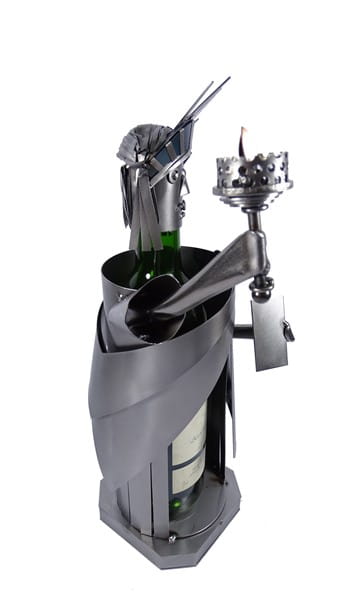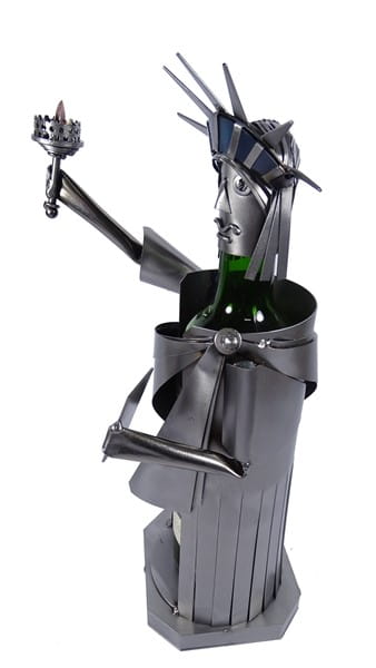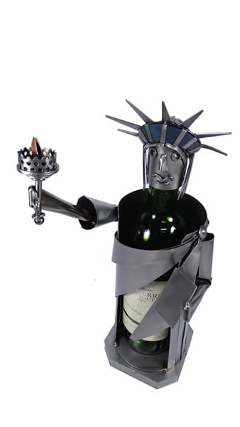 Metalowa figurka statua wolności jako stojak na wino. Swoją budową pomieści każdą butelkę kształtem przypominającą butelkę wina.