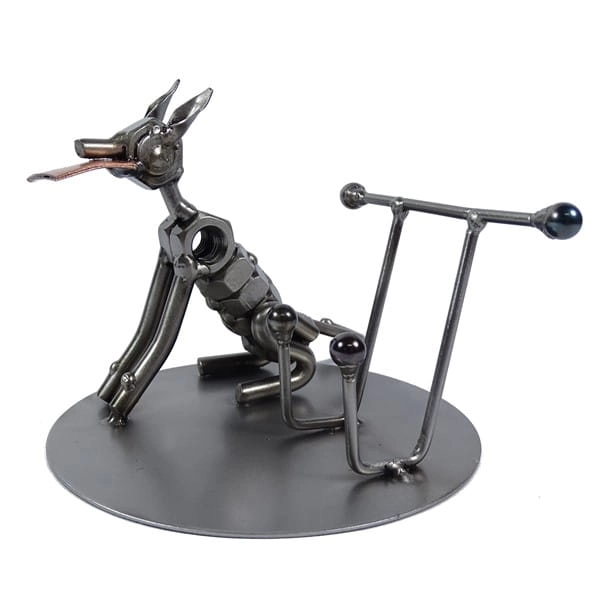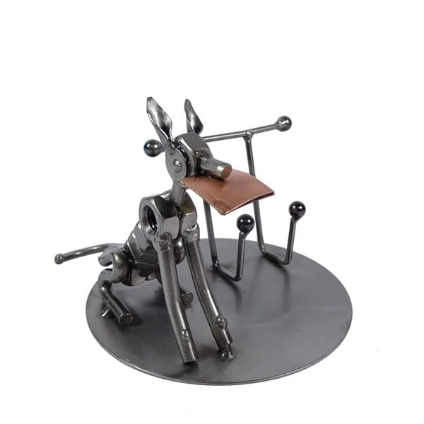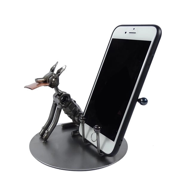 Metalowy stojak na telefon z figurką psa. Wyjątkowe połączenie industrialnego stylu z praktycznym rękodziełem.