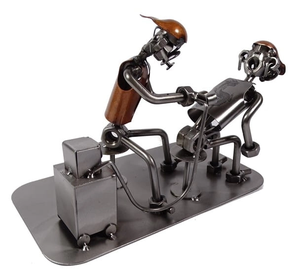 Metalowa figurka przedstawiająca Tatuażystę przy pracy.