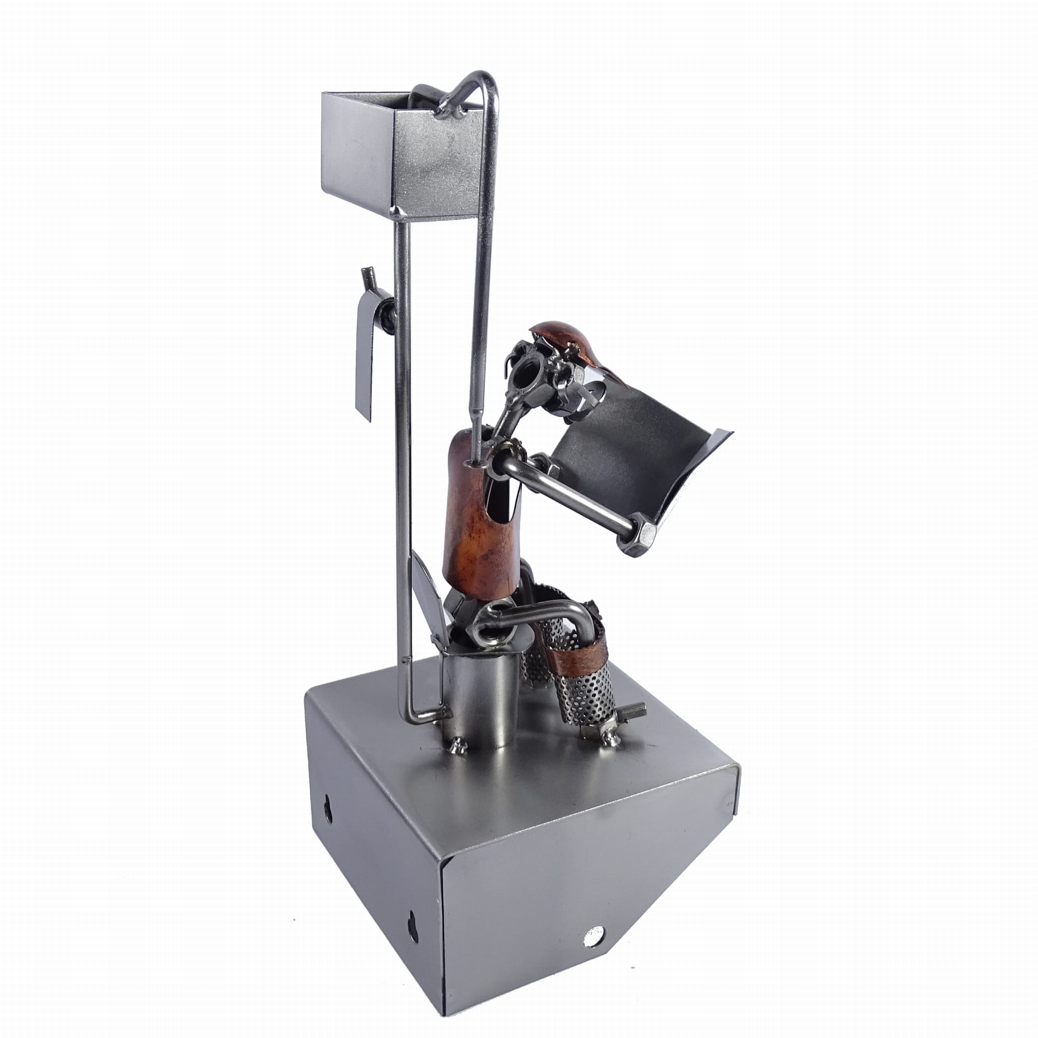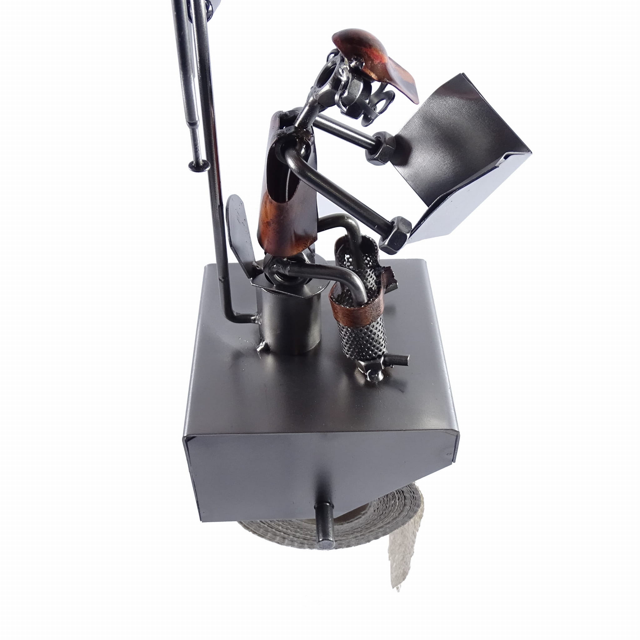 Metalowa figurka przedstawiająca człowieka na WC z gazetą. To również ciekawy sposób na rolkę papieru toaletowego.