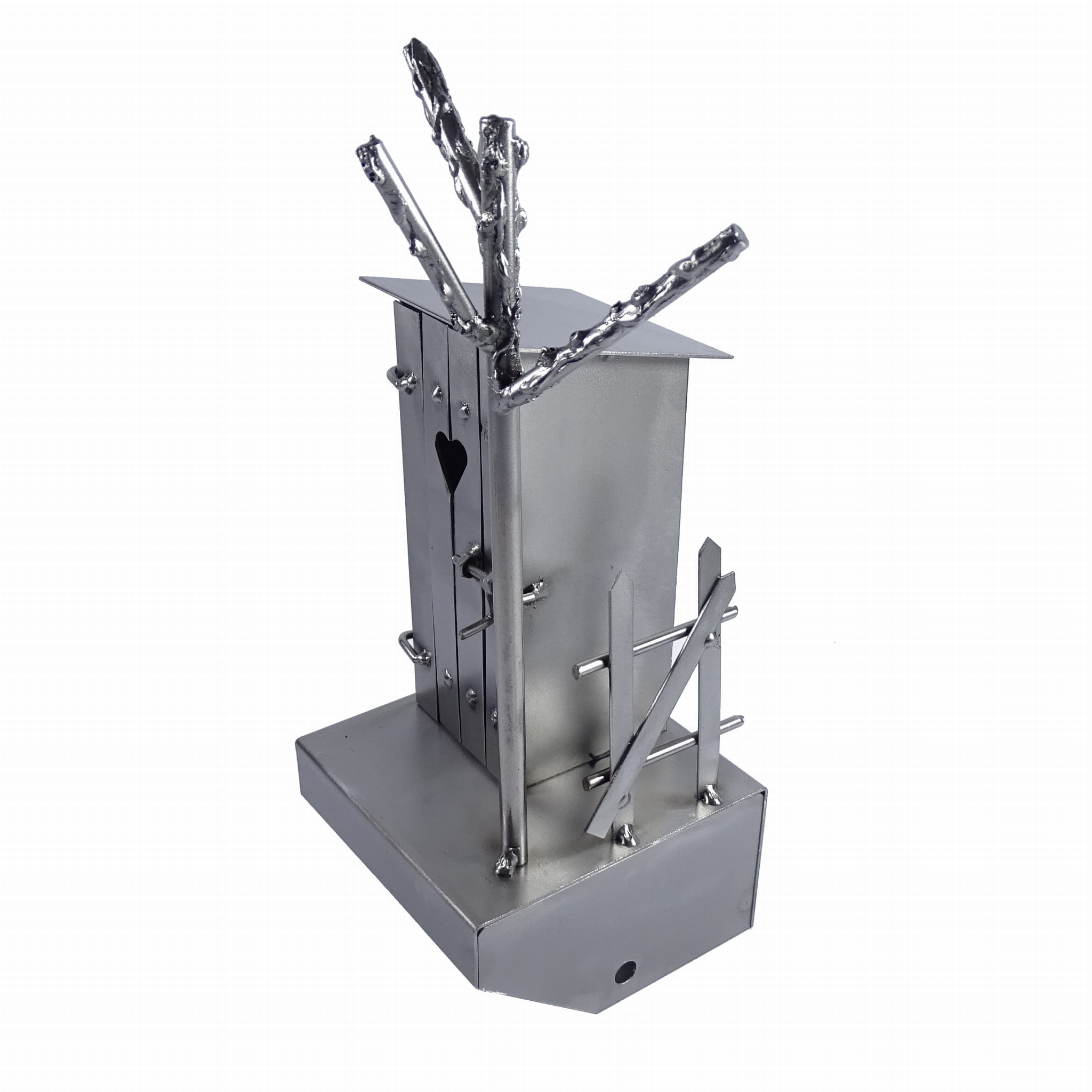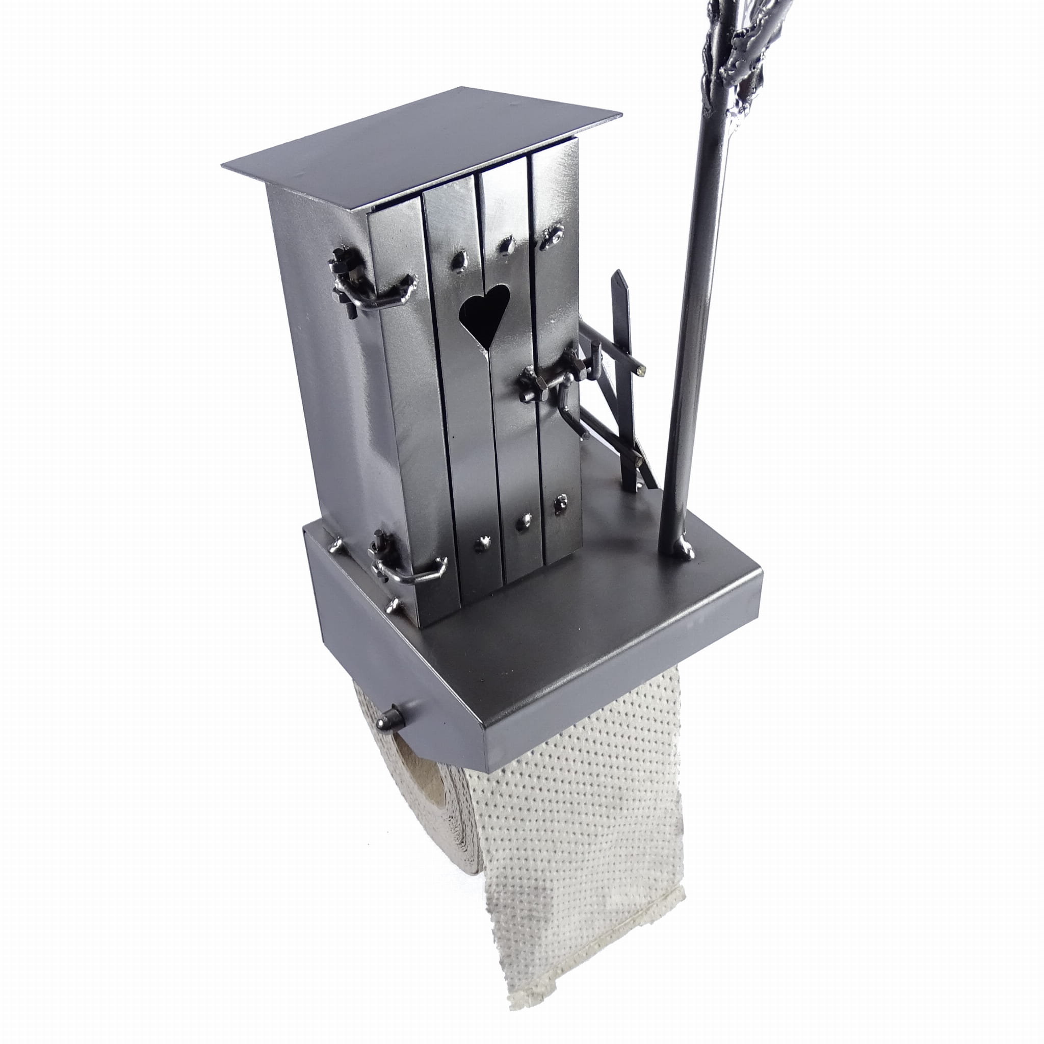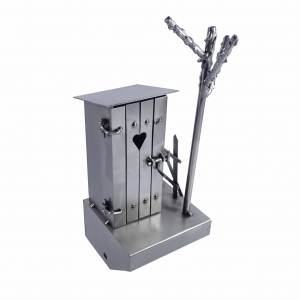 Metalowa figurka przedstawiająca wiejskie WC z serduszkiem w drzwiach .
