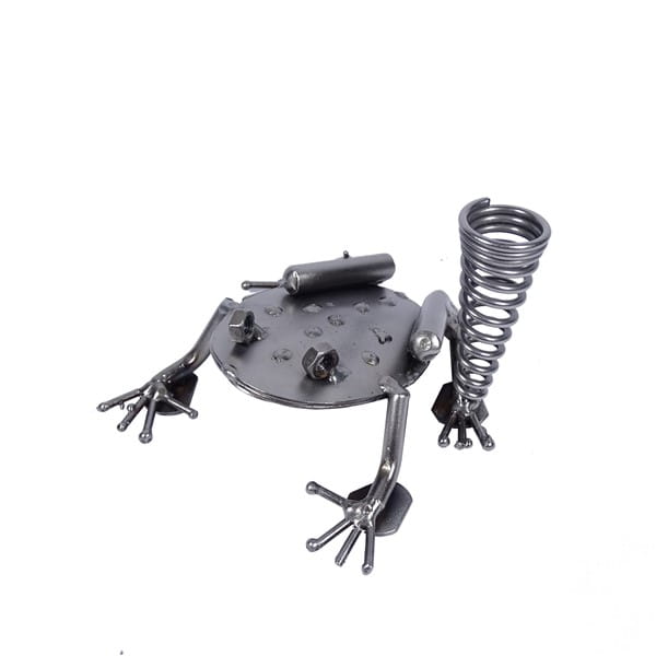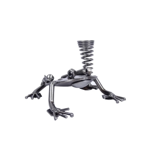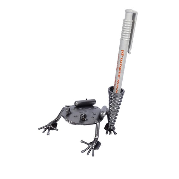 Metalowa figurka przedstawiająca żabę z uchwytem na długopis.