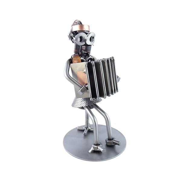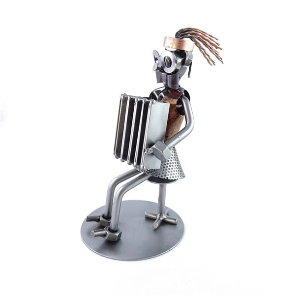Metalowa figurka przedstawiająca kobietę grającą na akordeonie