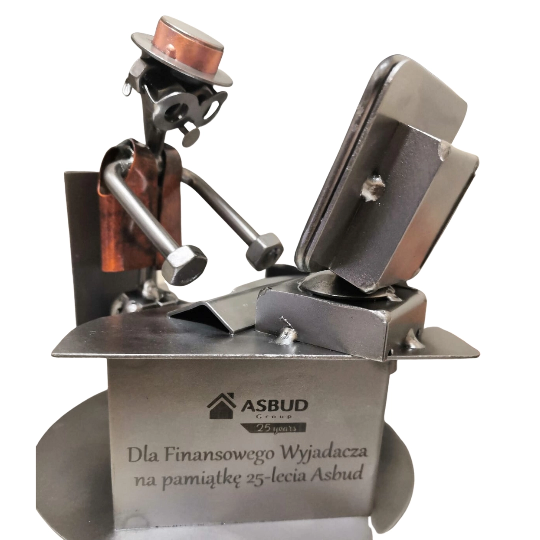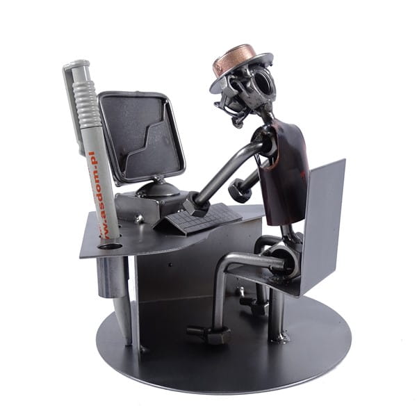 Z dumą prezentujemy metalową figurkę przedstawiająca pracownika biurowego przed komputerem.