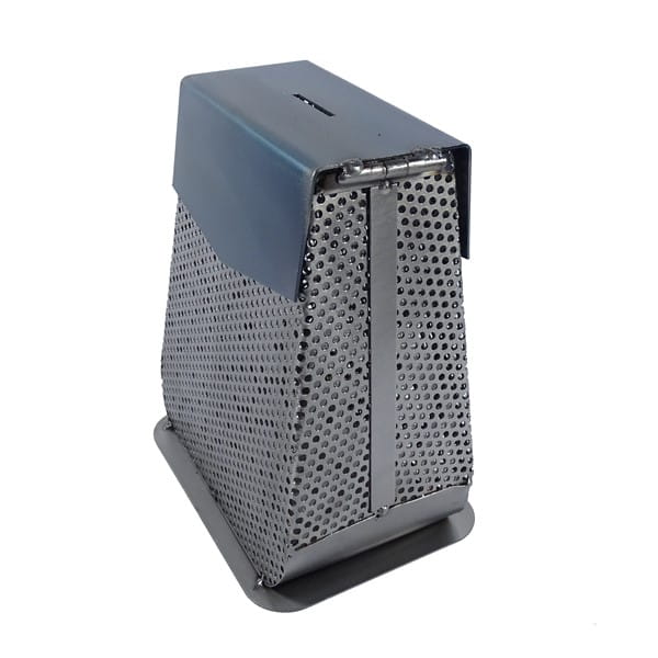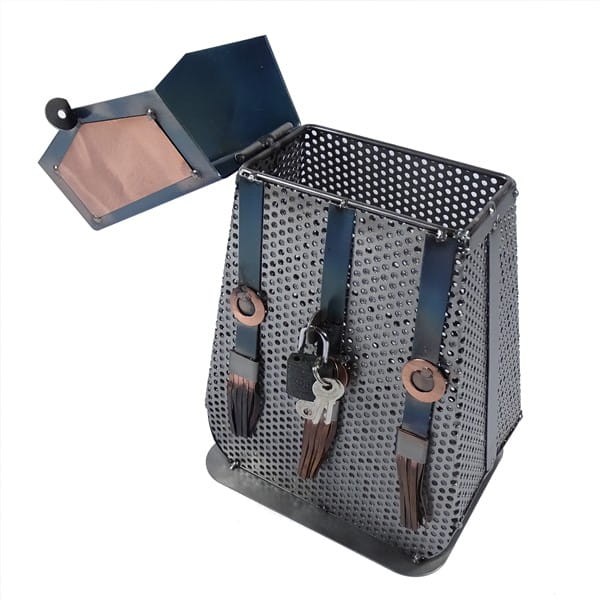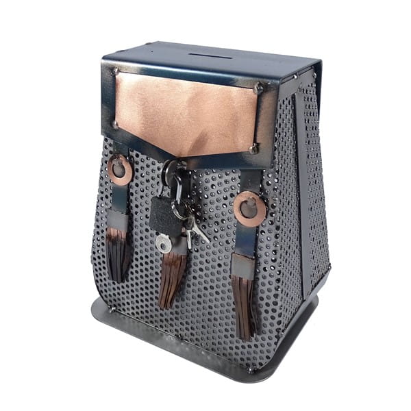 Metalowa sakwa służąca jako skarbonka w szkockim stylu.
